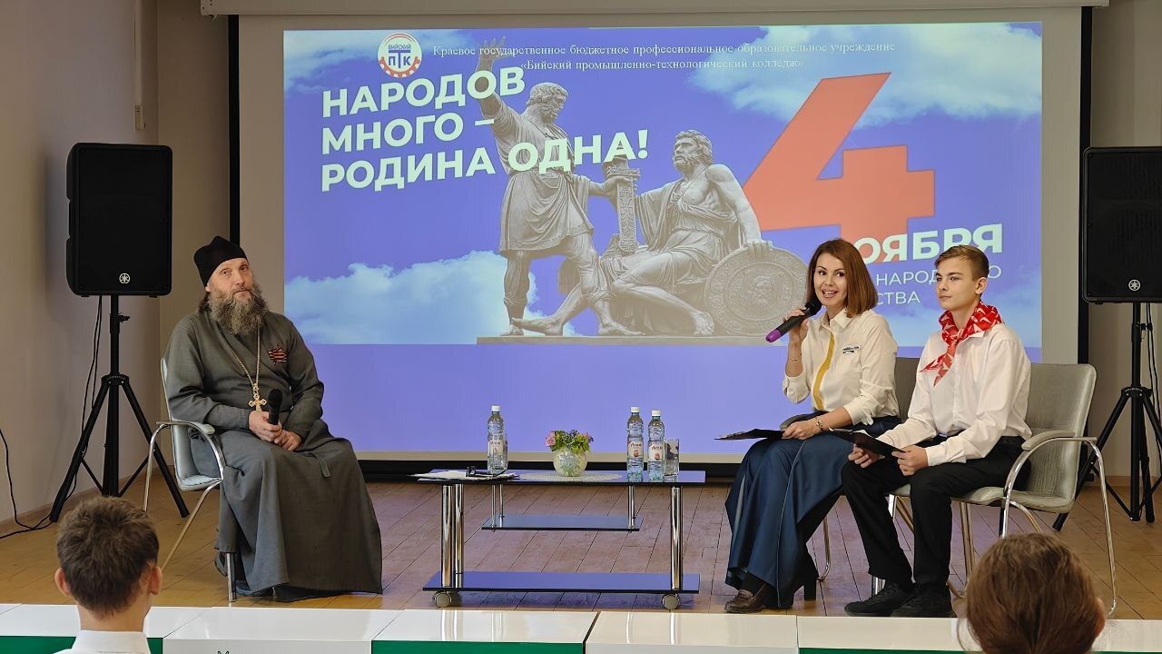Сегодня в стенах Бийского промышленно-технологического колледжа состоялась важная встреча студентов со священнослужителем храма Казанской иконы Божией Матери, руководителем отдела по взаимодействию с Вооружёнными Силами и правоохранительными органами отцом Димитрием. Это событие стало ещё одним звеном в цепочке мероприятий, направленных на укрепление духа патриотизма среди молодёжи.