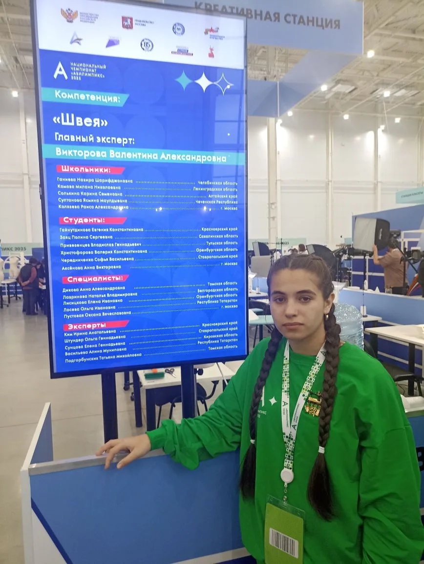 Карина соревновалась в компетенции «Швея», где ей предстояло изготовить женскую блузу полуприлегающего силуэта с короткими рукавами по заданному крою с учетом техники пошива и отделки.